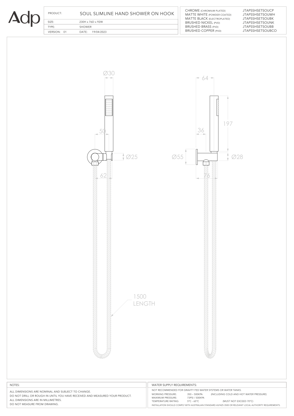ADP Soul Slimline Hand Shower On Hook – Brushed Copper