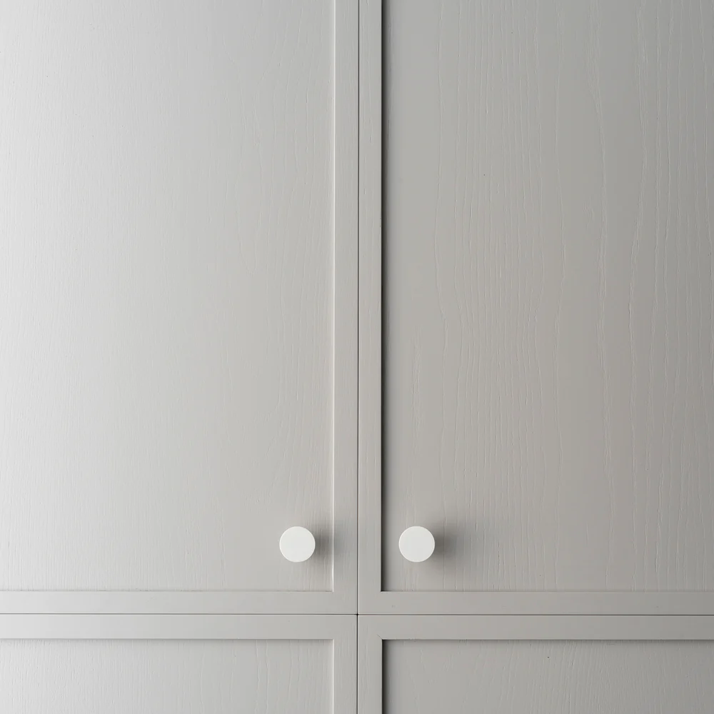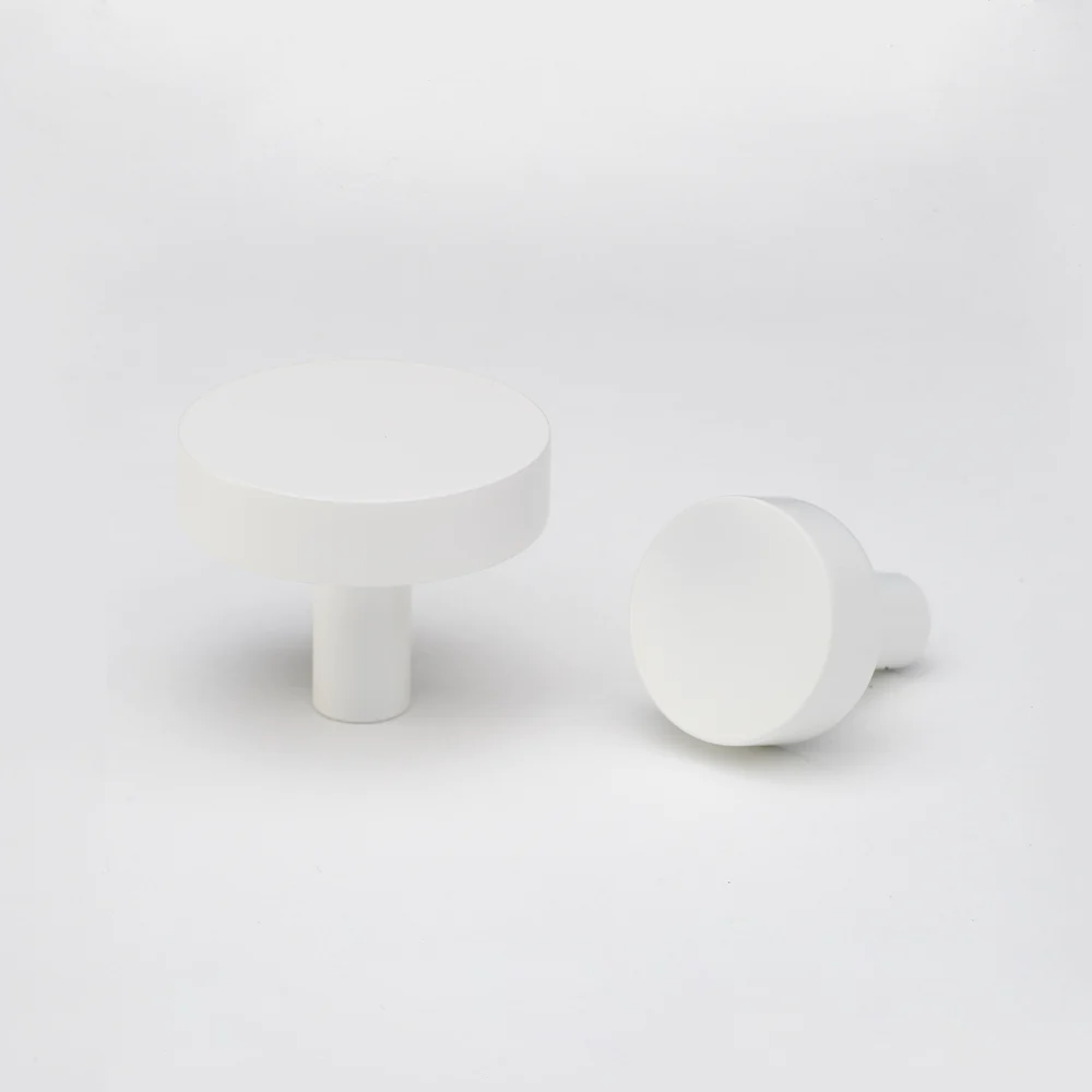 Solid brass round knob, powder coated matte white. Small size measures 25mm diameter. Large size measures 38mm diameter. Both with a 30mm projection. Comes with mounting hardware for use as a wall hook or a cabinetry knob.