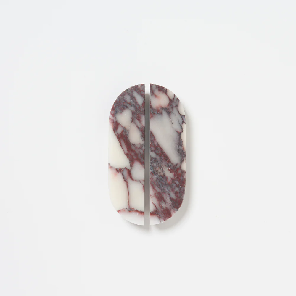 Bold luxury! Viola is our latest and most vivid marble range with striking burgundy veining for maximum impact! The Dot Handle Viola is sold as a pair with a stunning honed finish, measuring 160mm long, 40mm wide and 20mm thick with arch shaped ends. Please note these stunning handles are crafted from natural marble and characterised by irregular veining. No two pairs are alike which only adds to their charm and beauty.