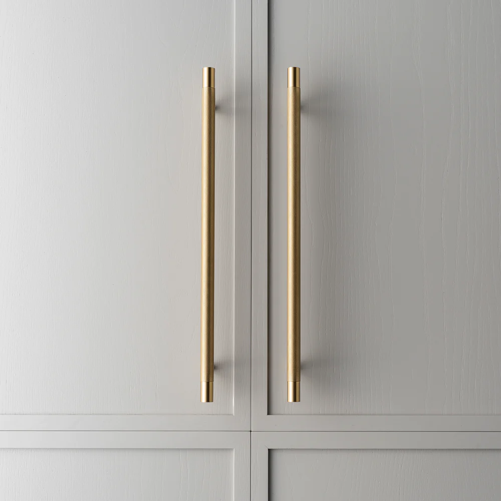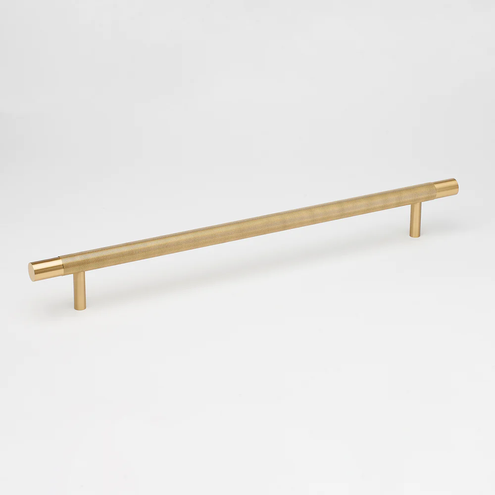 Solid brass 500mm long Kintore Appliance Pull, with beautiful knurling detail and satin brass ends. This long and weighty pull is perfect for integrated appliances and larger cupboards.