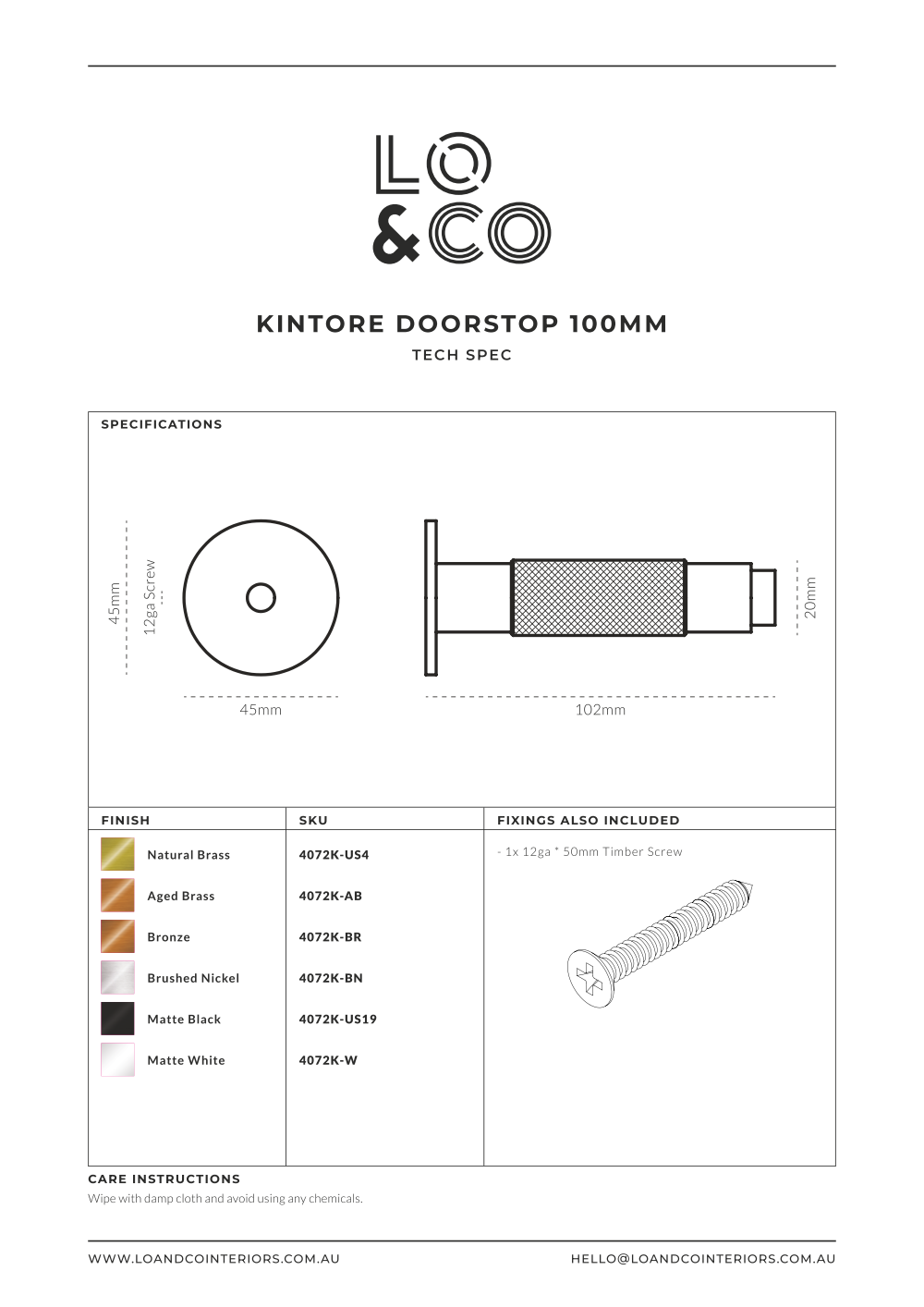 Bringing the Lo & Co signature style to our unique range of door accessories. With diamond knurling detail this doorstop range is synonymous with style and the perfect accompaniment to our Kintore range of cabinet pulls and lever handles. Designed to be wall mounted with a 102mm projection. Solid brass with an electroplated brushed bronze finish.