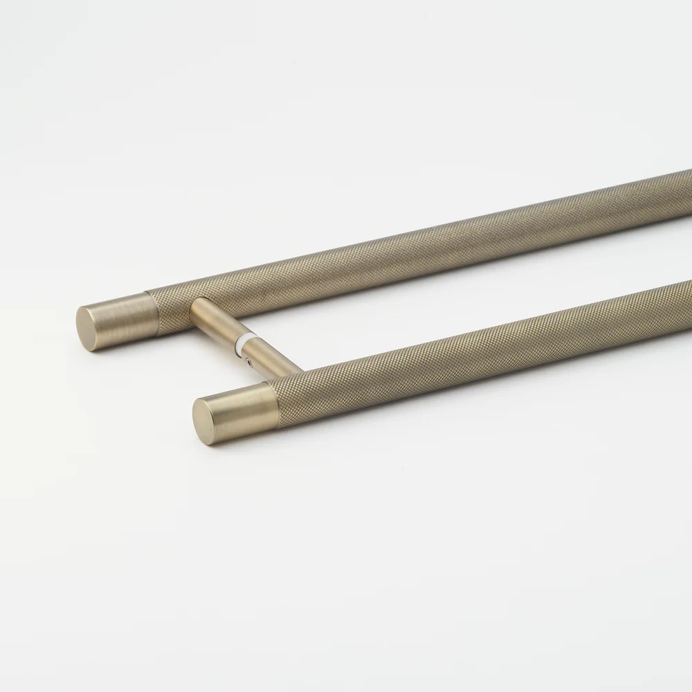 500mm long Kintore Entry Pull with elegant knurling detail, crafter in solid brass and electroplated with an aged brass finish. Suitable for double sided cavity slider doors and entry doors. Comes as a pair with the mounting hardware for front and back installation.