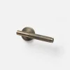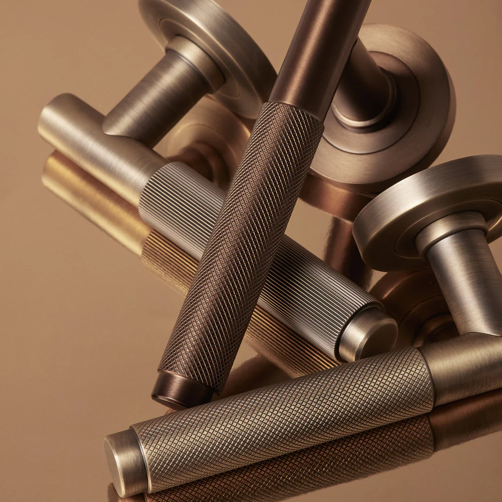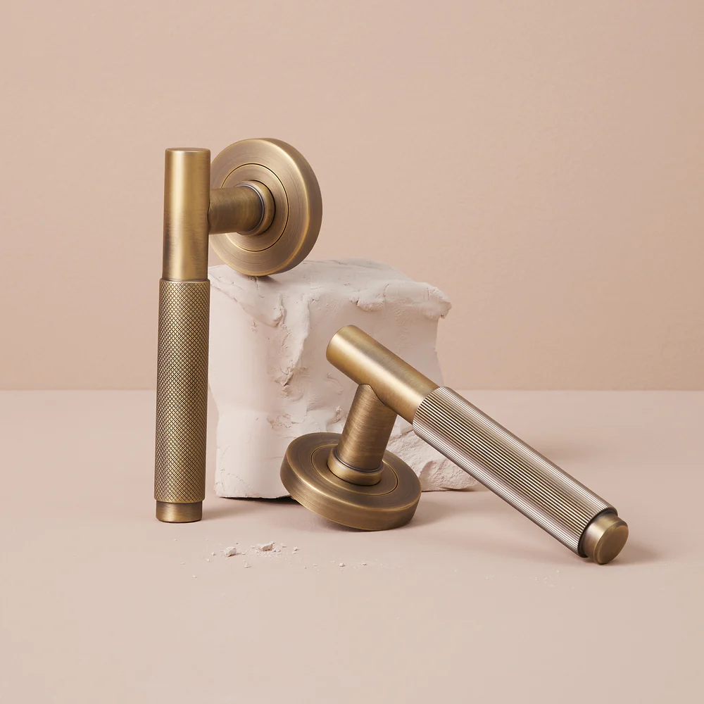 The Kintore Lever features soft diamond knurling, crafted in solid brass with an electroplated aged brass finish. The lever handle comes as a back-to-back set with with a matching finish striker plate and is designed to be fitted to internal doors. Measures 145mm long with a 70mm projection. Round backplates measure 55mm in diameter.