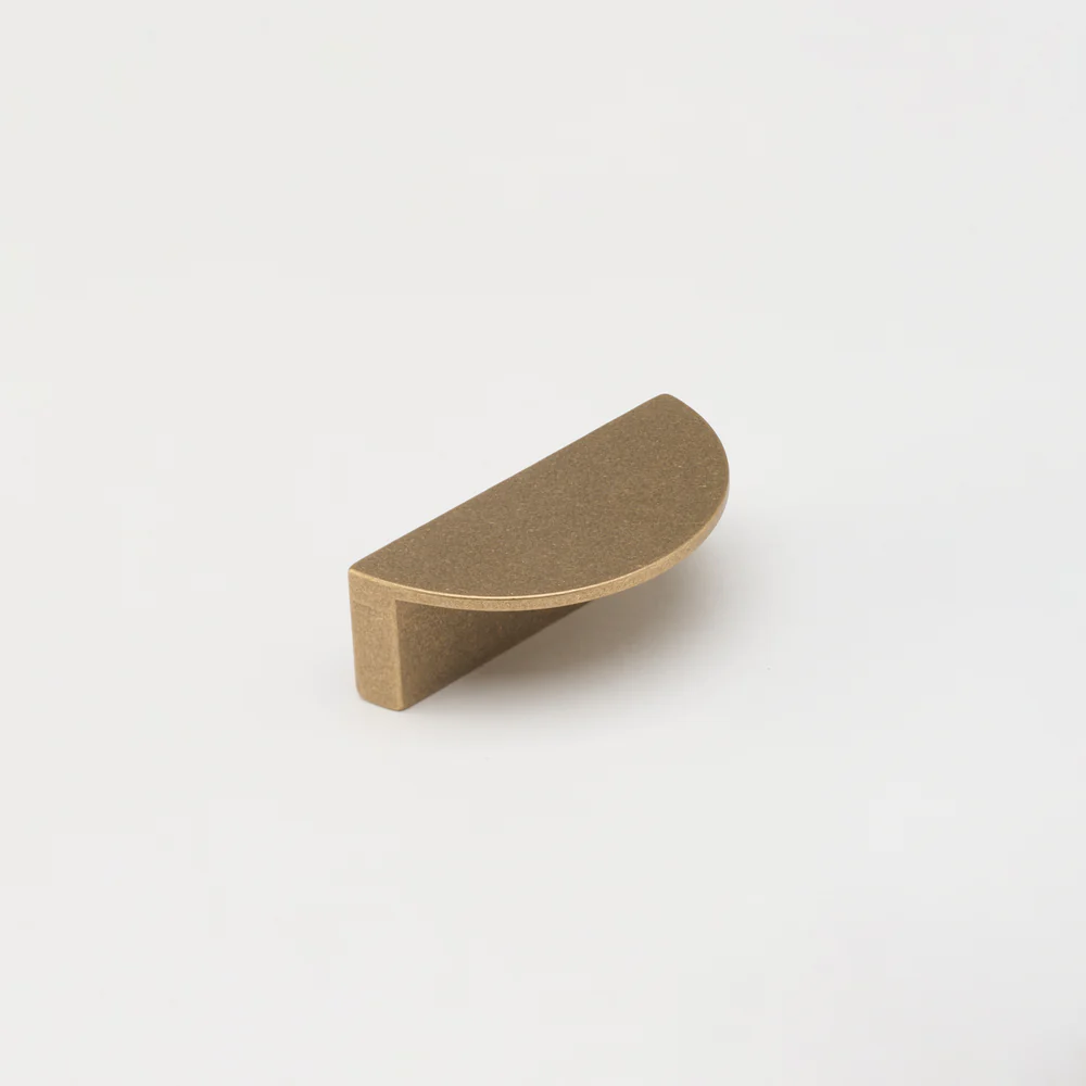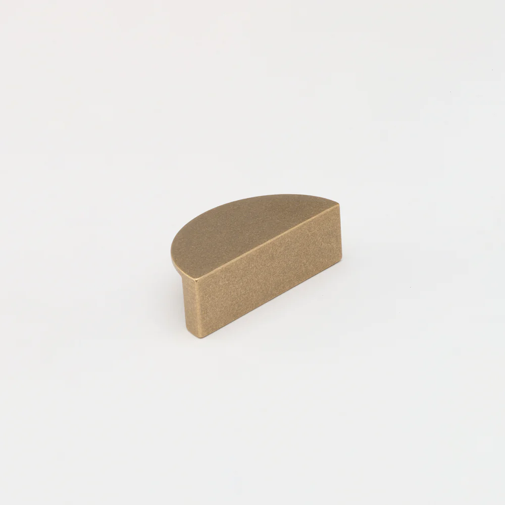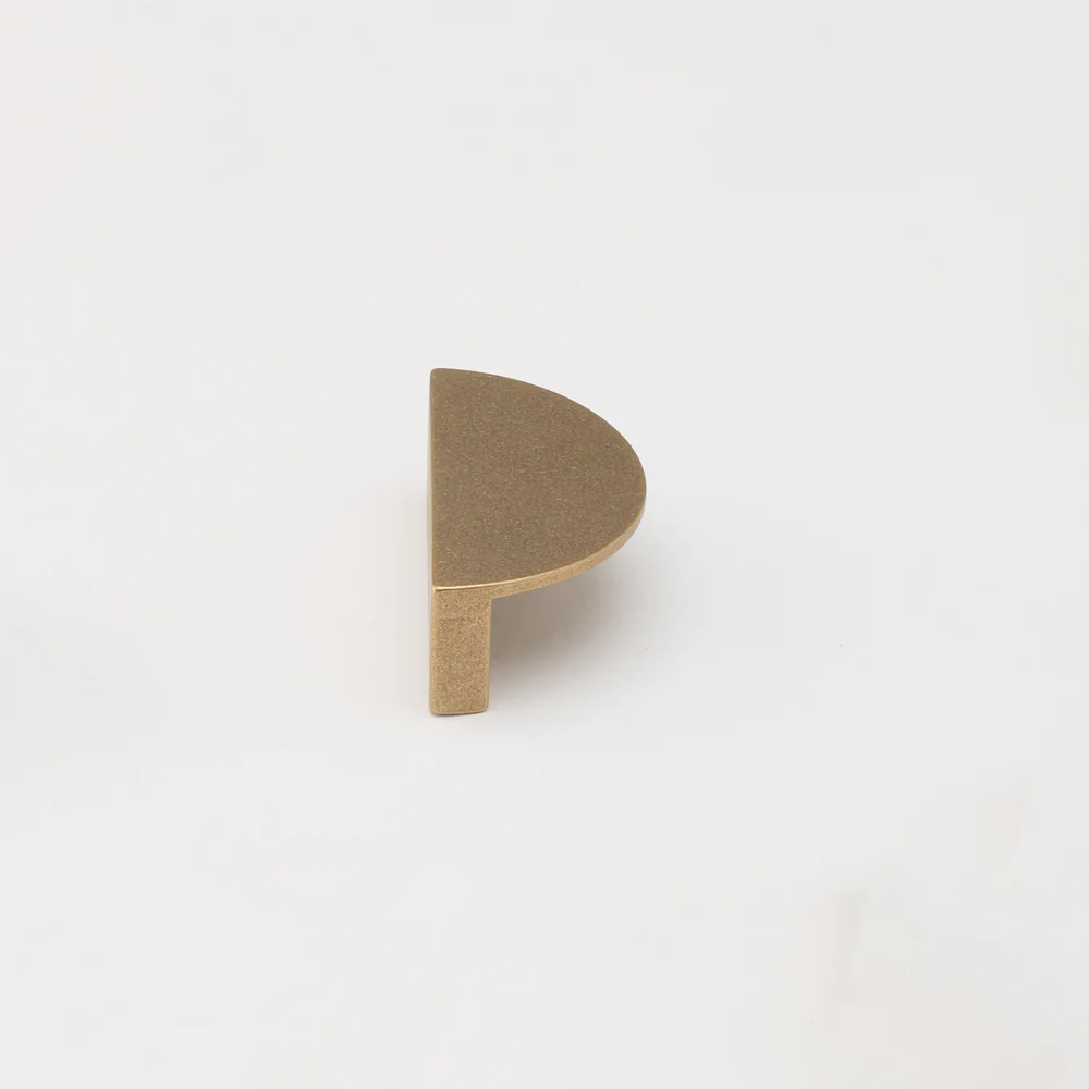 Solid tumbled brass Luna Pull. This stunning, solid half moon pull is perfect for cupboards and drawers alike. Measures 38mm wide, 75mm tall, with a projection of 25mm.
