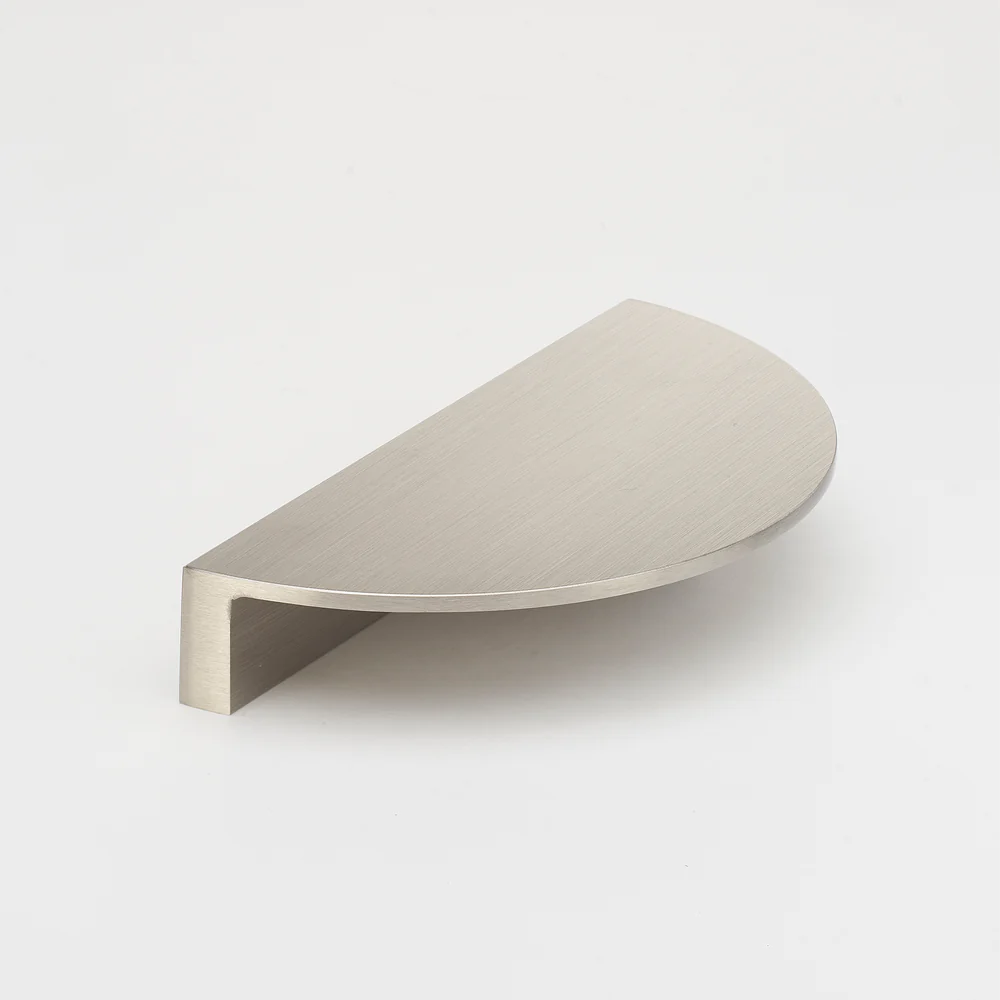 Solid brass Luna Pull XL with an electroplated brushed nickel finish. This stunning half moon pull is the perfect selection for doors and drawers, and can also be used as an appliance pull. Measures 75mm wide, 150mm tall, with a projection of 25mm.