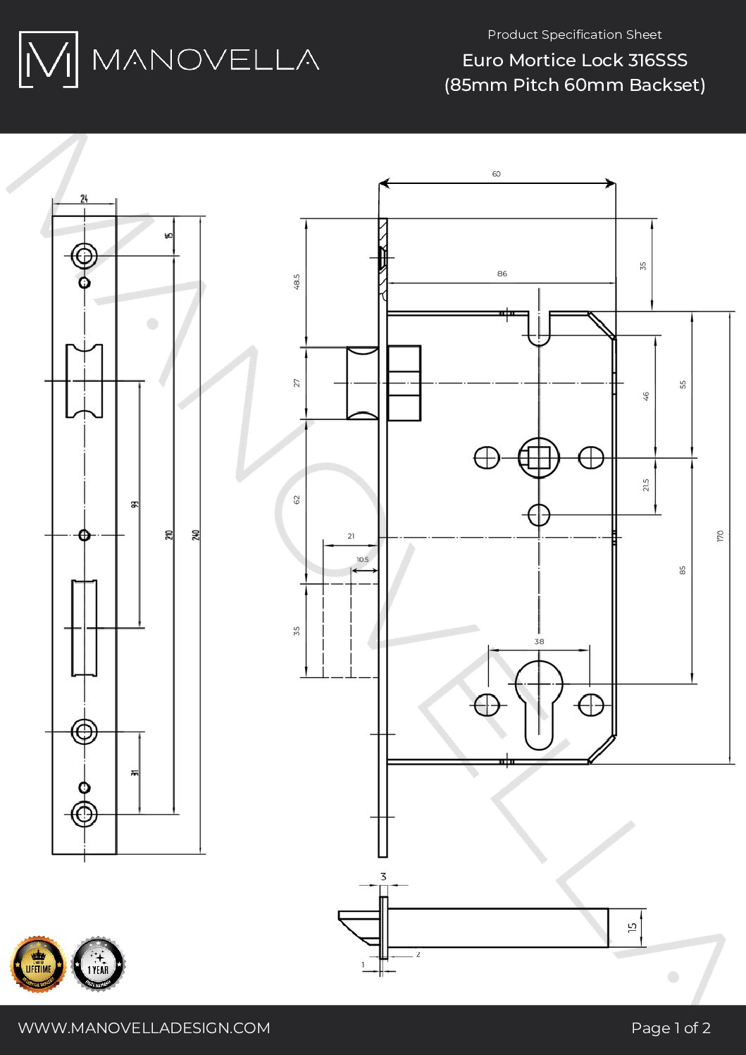 - 60mm Backset, 85mm Pitch