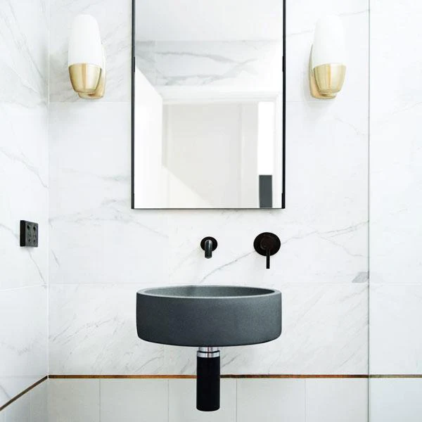 With its sleek walls and clean-cut edges, the concrete Hoop Wall Hung Basin by Nood Co adds a refined touch to the bathroom. important note Assembly: Please install bracket direct to masonry or timber wall, prior to sheeting and tiling. Click spec sheet for all bracket and basin info, suggested tap length and more.