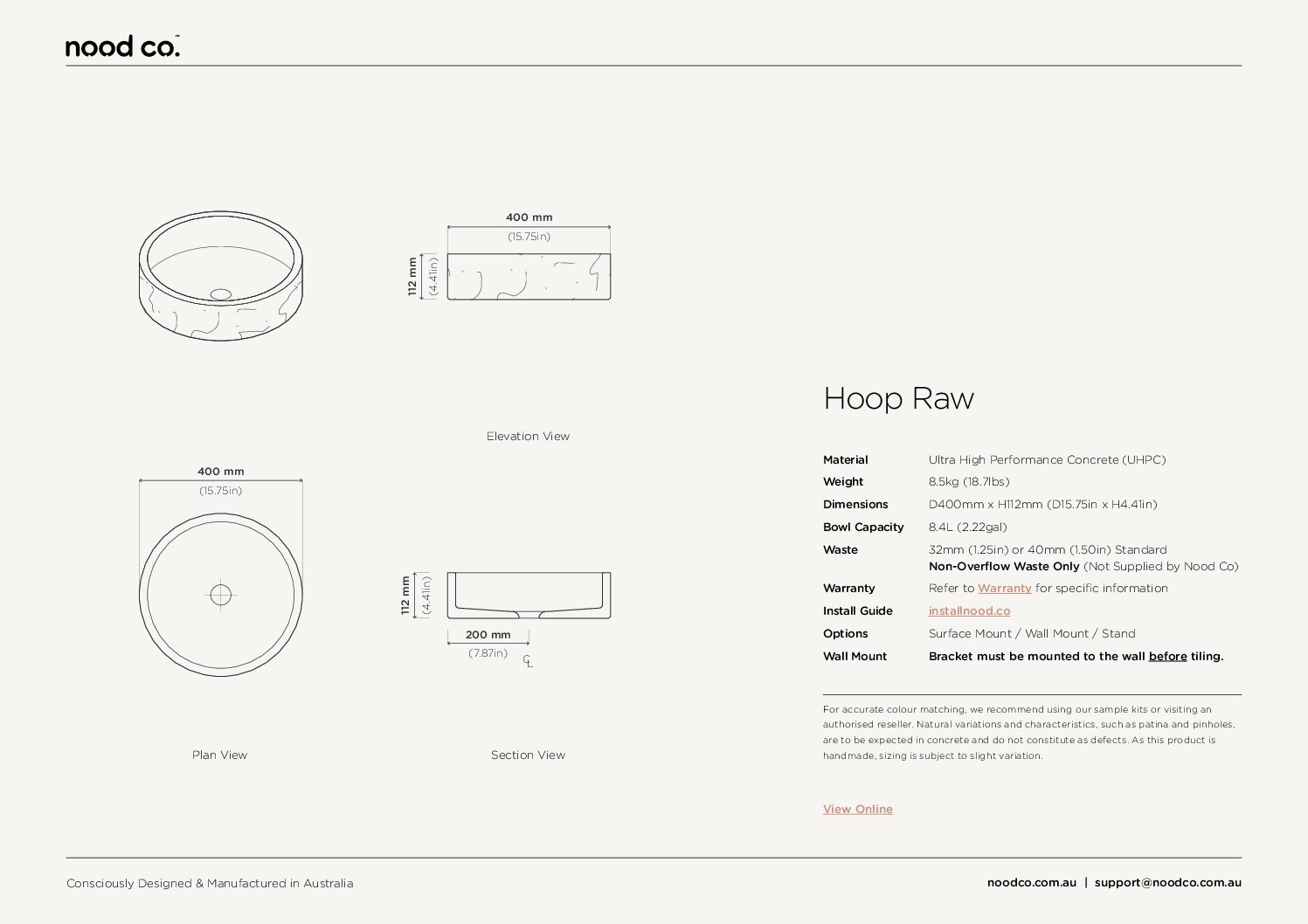 | Waste Rqd | 32mm (1.25in) or 40mm (1.50in) Standard Non-Overflow Waste Only (Not Supplied by Nood Co) |