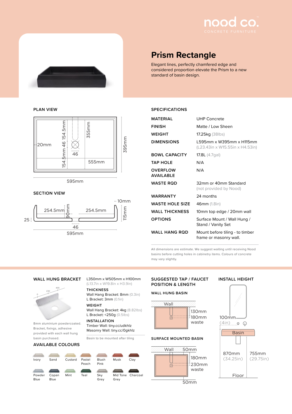 A favourite at Nood Co, the alluring Prism Rectangle Wall Hung Basin is a concrete sink featuring an elegant chamfered edge with a breathtaking high strength finish. Enjoy a refined, clean setting with Nood’s unique hidden bracket system.