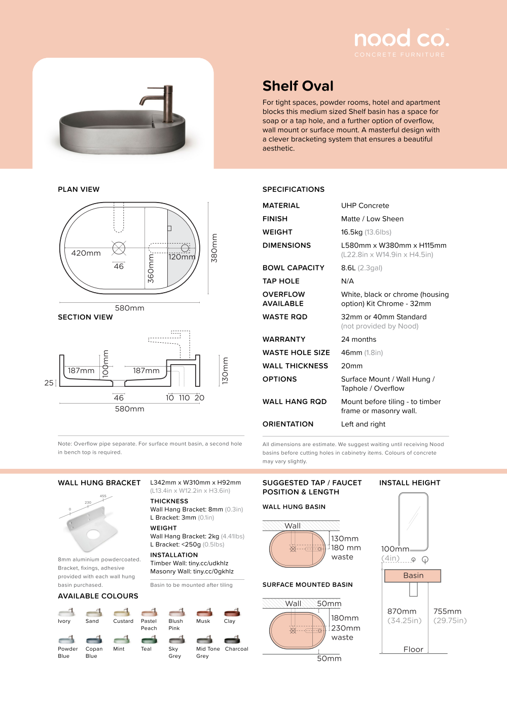 Important note Assembly: Please install bracket direct to masonry or timber wall, prior to sheeting and tiling. Click spec sheet for all bracket and basin info, suggested tap length and more.
